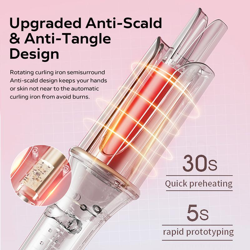 4.Upgraded Anti-Scald & Anti-Tangle Design: Rotating curling iron semisurround Anti-scald design keeps your hands or skin not near to the automatic curling iron from avoid burns. 15 cm rotating tail cord make sure you have enough operating space. 30 minutes auto turn off, no worry about whether the power is off.
