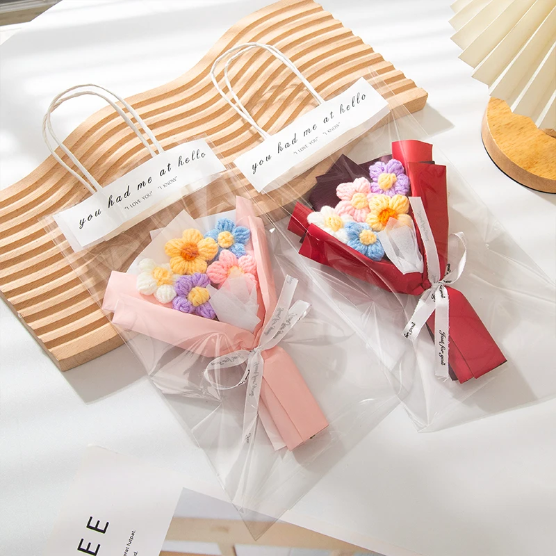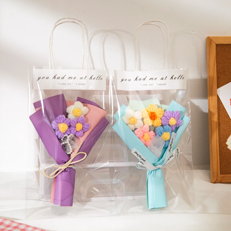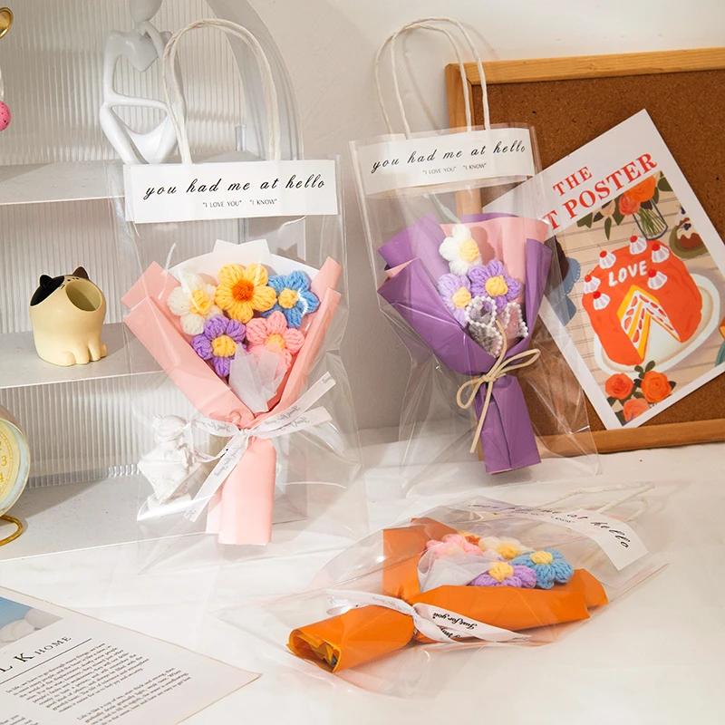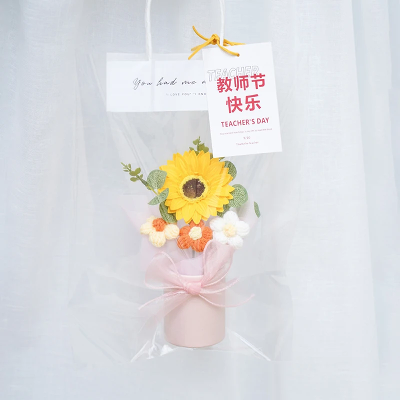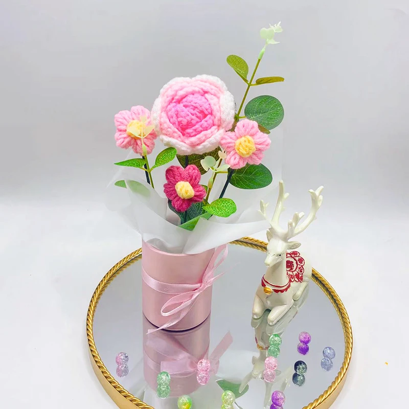 1. Milk Cotton Material: This knitted flower bouquet are made of milk cotton and packaged with paper flowerpot, fine workmanship.