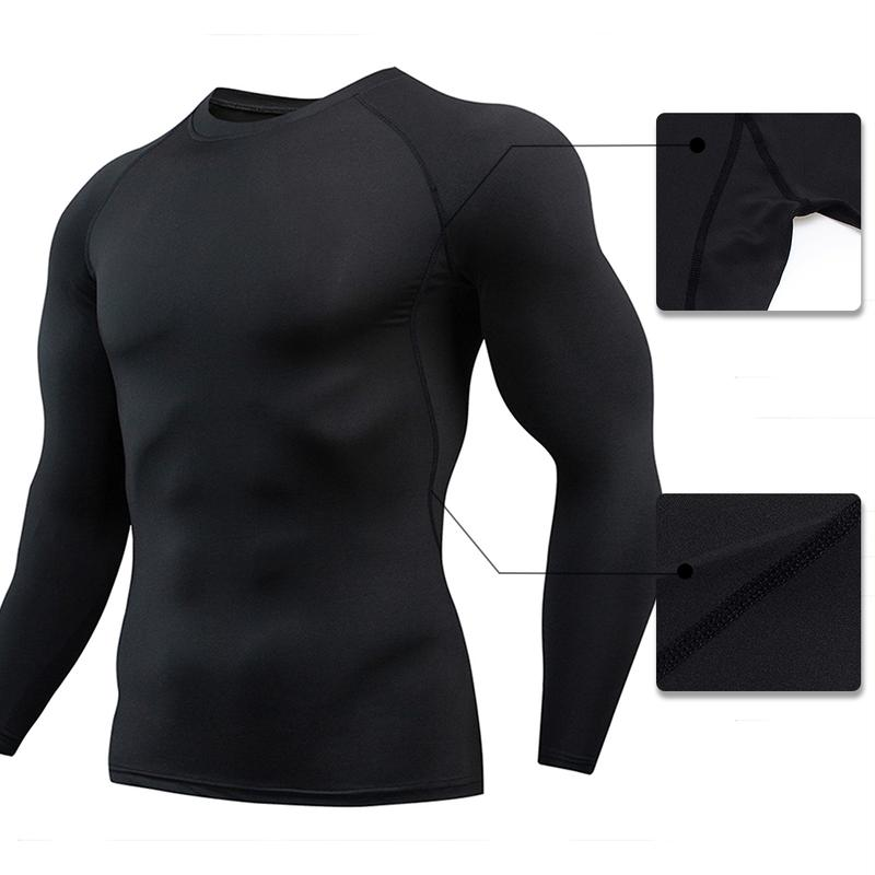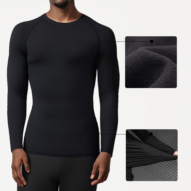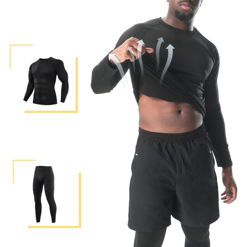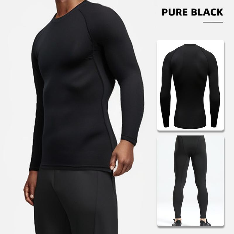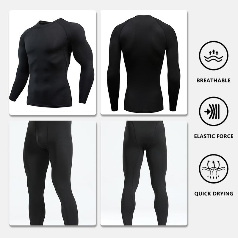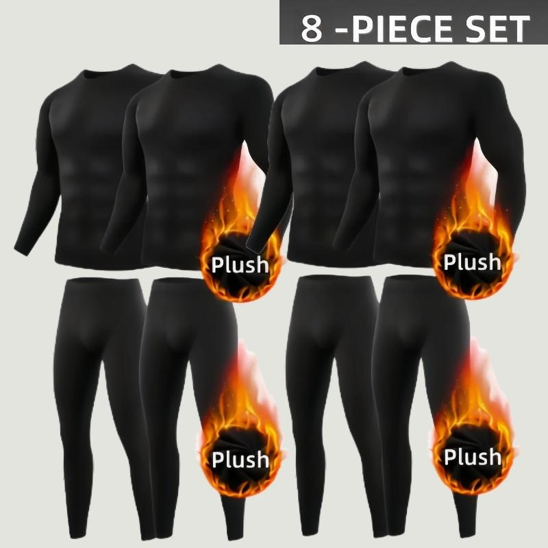 Four-Piece Men’S Thermal Underwear Long-Sleeved Suit, Sports Outdoor Thermal Underwear Tops and Pants Men, Autumn, Winter Warm Sports Pure Black Suit Clothing Menswear Polyester Stretch Stylish Plain