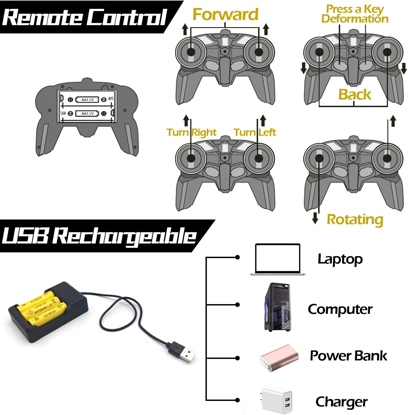 - 2 In1 RC Transform Car Robot: 1: 18 Scale size. 2 In 1 remote control deformation car and robot. One Button easily transforms back and forth from car to robot. Easy To Control. Cool RC car toys gift for 8 year old boys girls and up