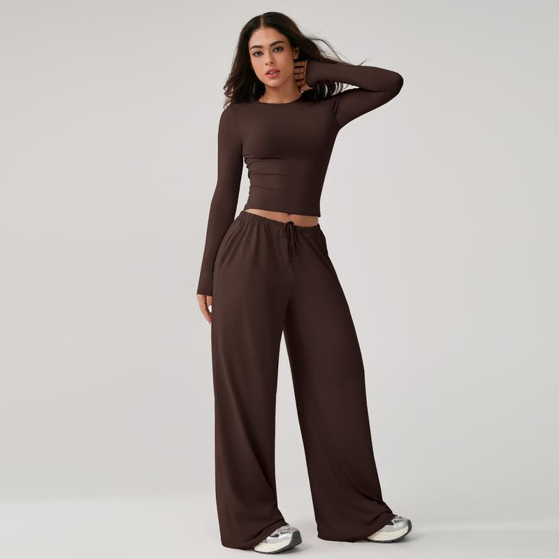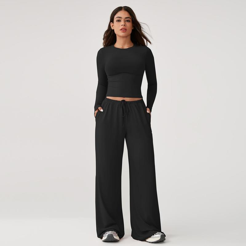 Timeoff Women’S 2-Piece Activewear Set Long-Sleeve Crop Top & Wide-Leg Pants Stretchy Fabric for Yoga Leisure Daily Active Scenarios Workout Running Clothes